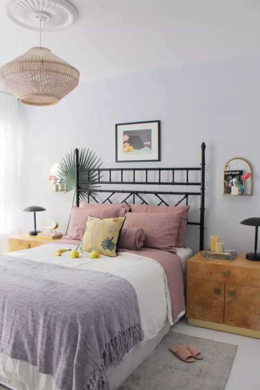 Saat Anda menggunakan warna lavender untuk warna cat kamar tidur, Anda disarankan untuk memadukan dengan banyak warna netral atau warna feminin dan senada pada furnitur dan tekstil untuk mengimbangi tone dominan pada dinding.