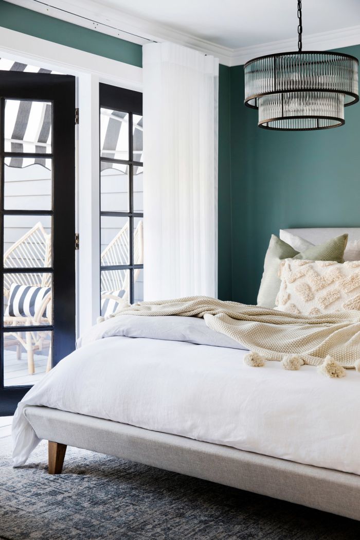Pada kamar tidur, Anda bisa menggabungkan warna teal dengan warna putih dan hitam. Ketiga warna ini akan sangat sempurna saat disandingkan satu sama lain. Cat dinding kamar tidur dengan warna teal, lalu gunakan warna putih pada ceiling, gorden, dan tempat tidur. Masukkan warna hitam sebagai aksen pada lampu gantung minimalis dan french door di kamar tidur Anda.