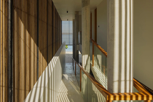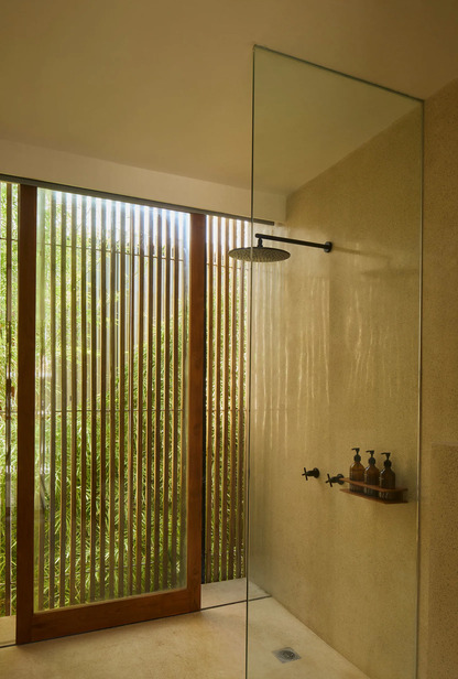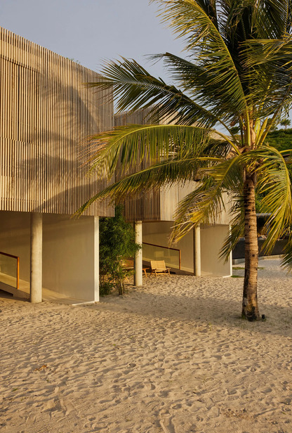 Lantai dasar beach house dialasi sand floor yang membuatnya menyatu alami bersama permukaan pantai pasir putih di ruang terbuka langsung menghadap laut. Melalui akses berupa ramp, lantai atas mengusung konsep open living yang ditutupi deretan kayu tersusun vertikal. Dengan demikian menciptakan suasana intim ditemani dengan permainan garis cahaya yang menembus melewati di antara kayu-kayu tersebut. Interiornya menggunakan kayu jati sedangkan outdoor deck menerapkan iron wood.