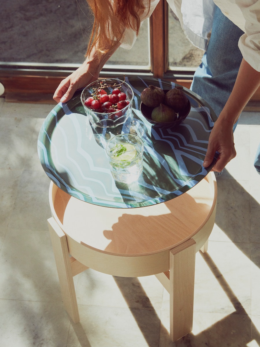 Seluruh produk perabotan dan aksesori menampilkan berbagai elemen mulai dari bangku kayu klasik, jubah mandi, handuk, lilin aroma elderflower, coffee table, bantal dudukan kursi hingga tas FRAKTA yang dihiasi motif daun rhubarb.Â