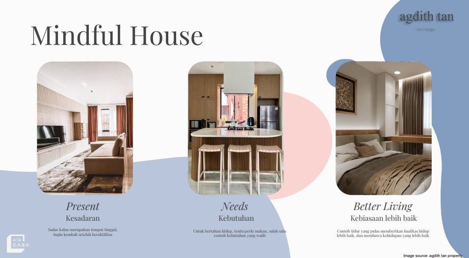 Melalui pandangan dari mata desainer interior Agdith Tan mengatakan, sebuah rumah bukanlah hunian biasa namun penghuninya akan menjadi mindful living jika seluruh panca indera berfungsi dan menghasilkan hidup yang present, needs, dan better living.Â