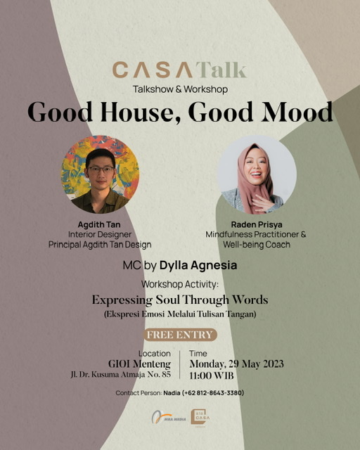 Bertepatan di akhir bulan Mei ini, CASATalk by AlaCASA menghadirkan pembicaraan mengenai Good Home, Good Mood untuk membicarakan lebih dalam mengenai cara mengelevasi kualitas hidup di rumah melalui elemen interior di GIOI, Menteng. Acara ini diisi oleh lima narasumber yang mahir di bidangnya. Dibuka oleh MC Dylla Agnesia, pembicara yang diundang pertama adalah Agdith Tan selaku desainer interior dan principal dari Agdith Tan Design, Raden Prisya sebagai Mindfulness Practitioner Well-being Coach, serta Putra Tjokro, Head of Content AlaCASA.Â