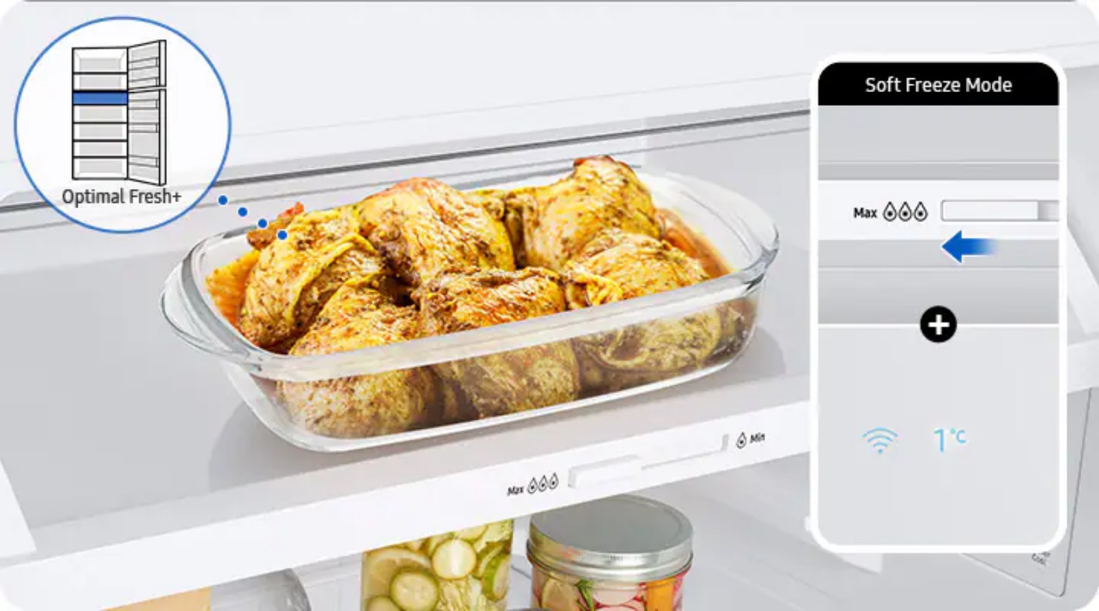 Selain itu kulkas juga punya beberapa mode di Optimal Fresh+. Soft freeze mode cocok untuk menyimpan makanan ungkep, daging, ayam, ikan, dan bahan makanan lain pada suhu -40C, sehingga bahan makanan bisa disimpan lebih lama tanpa menjadi beku, sehingga siap masak kapan saja, tanpa proses defrost.Â