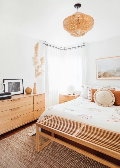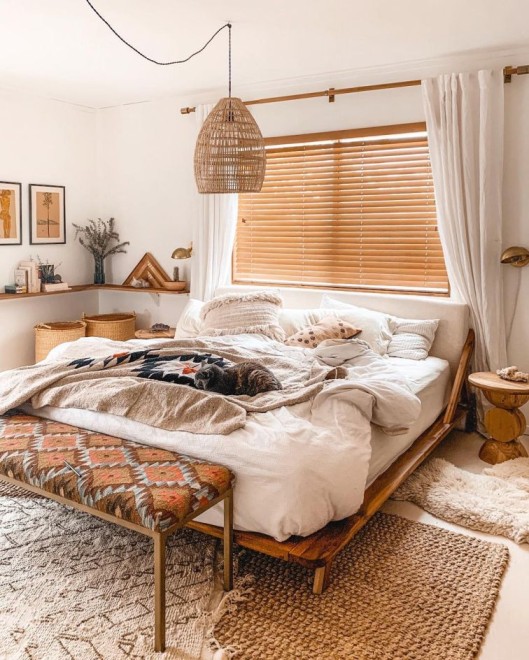 Skema warna serba putih pada dinding kamar tidur yang dipadukan dengan rona hangat alami dari aksen kayu adalah salah satu lambang bohemianisme. Mulai dari dipan tempat tidur, wall shelf, nakas, hingga batang gorden. Letakkan benches bergaya etnik di depan tempat tidur. Gunakan juga marcrame pillow dan lampu gantung rotan untuk menambah kesan boho di dalam kamar tidur.Â