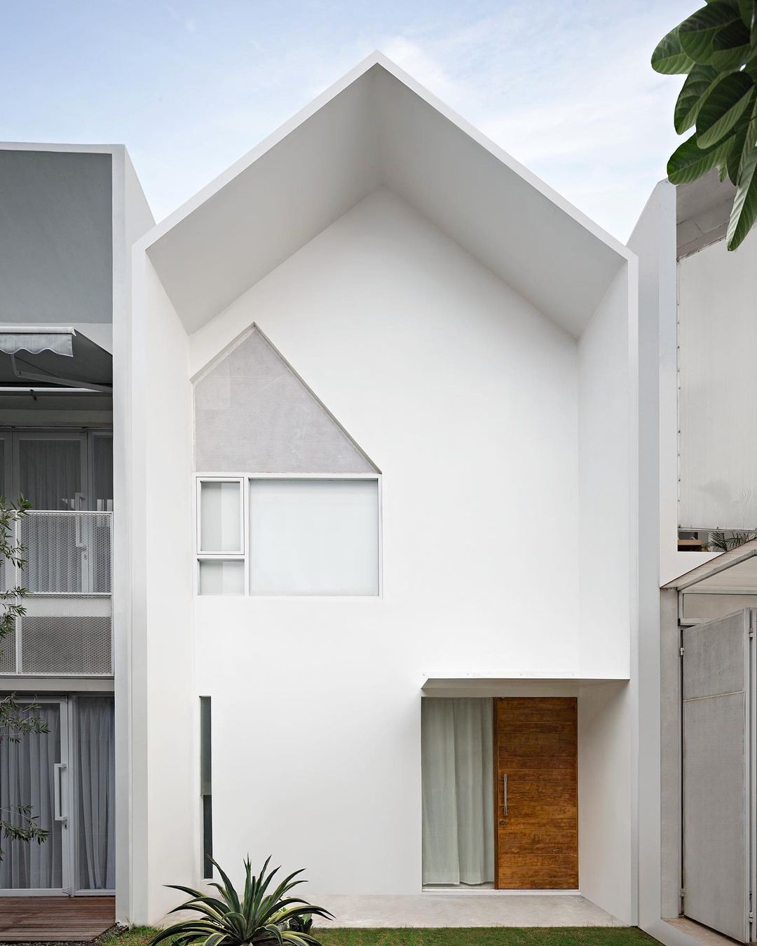 Fasad rumah kontemporer cenderung lebih menonjolkan bentuk-bentuk geometri yang unik dan kreatif, seperti misalnya, fasad rumah dengan desain melengkung atau arc ini. Tak hanya pada bagian jendela dan entrance way sebelum pintu masuk, bentuk lengkungan juga terlihat pada bagian atap rumah. Pemilihan warna yang didominasi putih dan warna hitam pada detail wrought-iron, membuat rumah ini tampak sangat cozy dan clean.