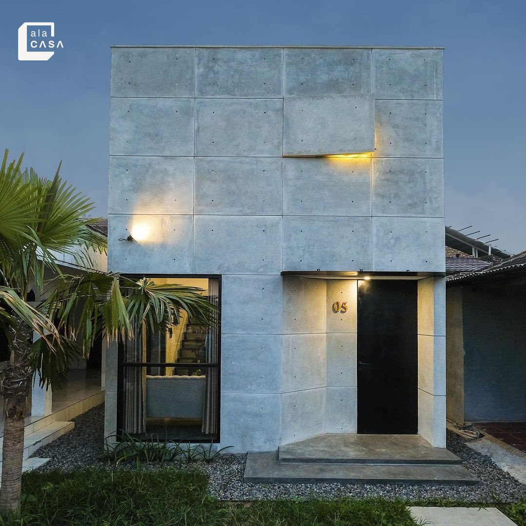Fasad rumah sederhana dari bahan concrete ini bisa jadi inspirasi Anda untuk diaplikasikan pada bagian eksterior rumah. Agar tidak terlalu terkesan plain, Anda bisa bereksperimen menggunakan lighting yang ditata dengan sedemikian rupa, yang bisa membuat fasad rumah terlihat jauh lebih indah.