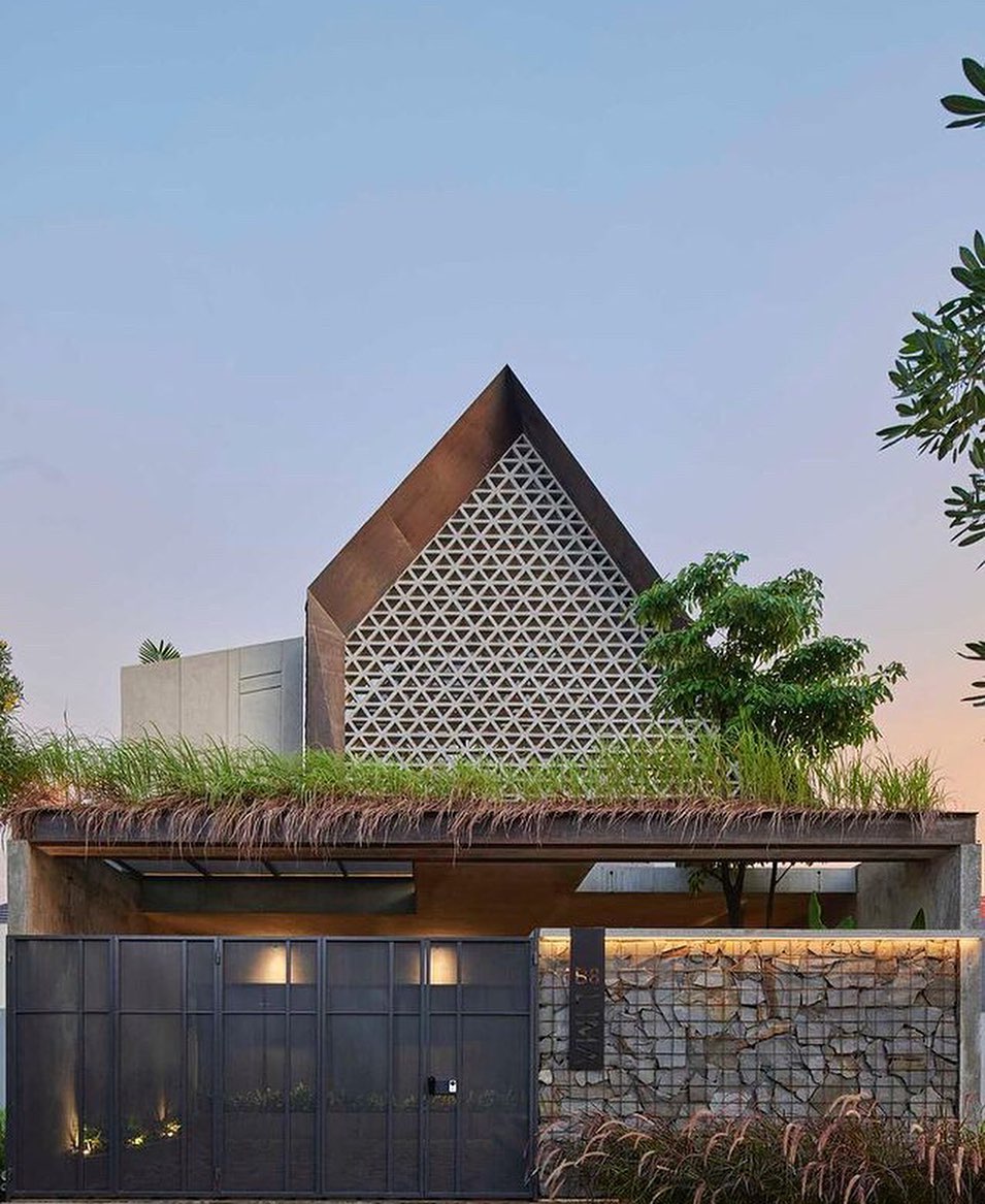 Bagian eksterior rumah ini menggunakan material roster, yaitu salah satu material bangunan yang berfungsi sebagai ventilasi udara. Bentuknya balok seperti batu-bata. Menyusun material roster sedemikian rupa bisa menciptakan detail unik dan menarik, serta menambah estetika pada fasad rumah.