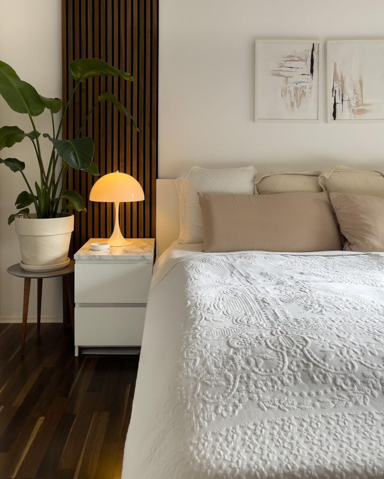 Memasang wood slats wall pada salah satu dinding dapat memberikan focal point yang sangat menarik untuk kamar tidur. Wood slats wall biasanya terbuat dari bahan plywood atau MDF dengan lebar sekitar 3-5 sentimeter yang disusun sejajar dan diterapkan dengan arah vertikal pada dinding.