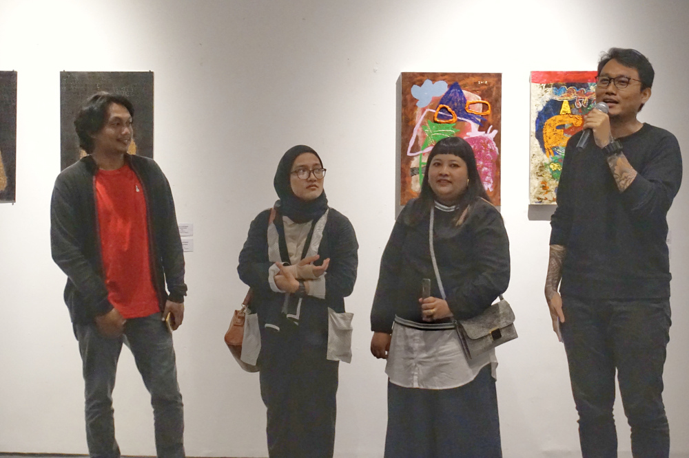 Tiga Seniman Anton Subiyanto, Naisyah Suherman, dan Citra Sasmita bersama kurator, Leonhard Bartolomeus