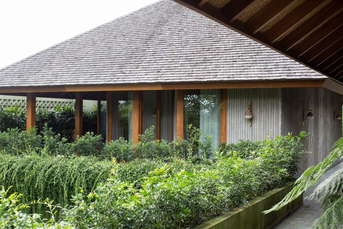 Nama “The Ravine” merupakan pengertian dari lembah kecil yang curam. Kondisi sekitar area yang rindang oleh pepohonan membuat desainer menyamarkan palet warna bangunan dengan hutan.