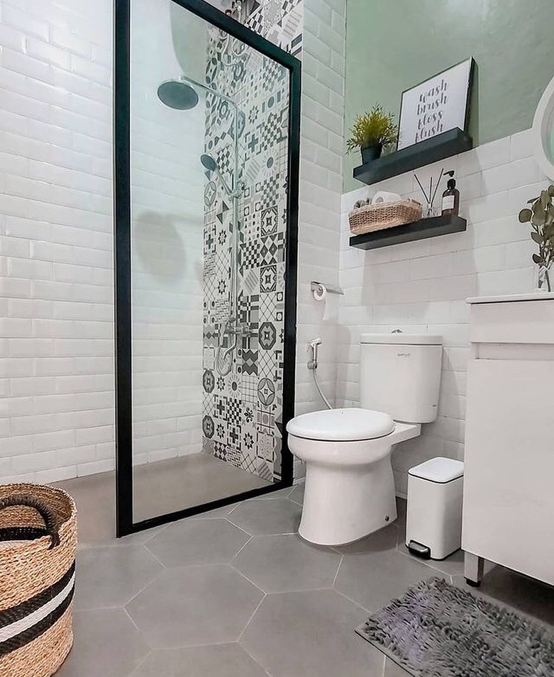 Selain perawatannya yang mudah, ubin porselen juga tersedia dalam banyak desain, gaya, dan warna, yang bisa Anda sesuaikan dengan konsep kamar mandi yang diinginkan. Atau, Anda bisa menyesuaikan skema warna lantai dengan ubin dinding kamar mandi.