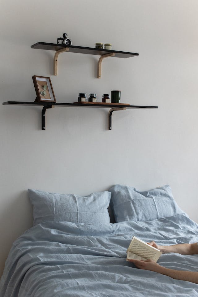 Untuk memaksimalkan ruang yang tersedia di kamar tidur, Anda bisa memanfaatkan dinding dengan memasang floating shelf untuk menyimpan beberapa barang (yang sekaligus bisa berfungsi sebagai dekorasi), seperti buku, koleksi benda favorit Anda, dan yang lainnya. Pasang floating shelf di atas tempat tidur Anda atau di atas meja untuk menambah penyimpanan vertikal.Â