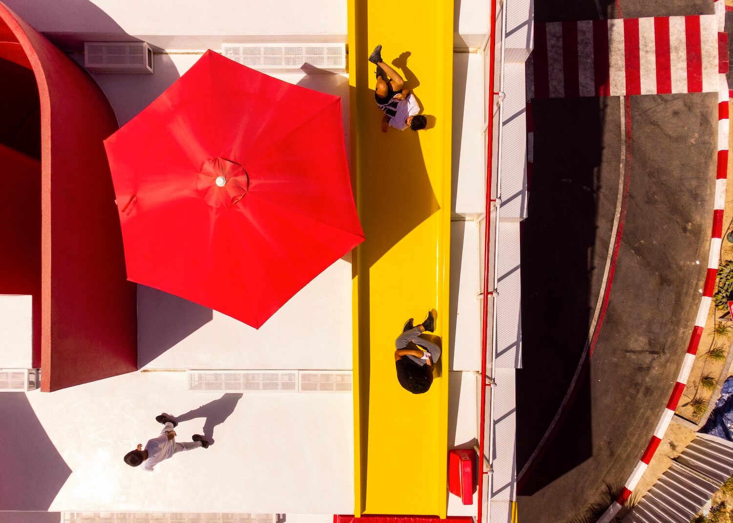 Penggunaan warna putih pada lantai yang mengkilap, warna merah pada langit-langit dan furnitur seperti kursi, meja dan payung. Serta perpaduan dengan warna kuning pada seluncuran di area bermain anak, merupakan perpaduan warna yang sempurna serta bisa menghadirkan suasana yang semangat dan meriah.