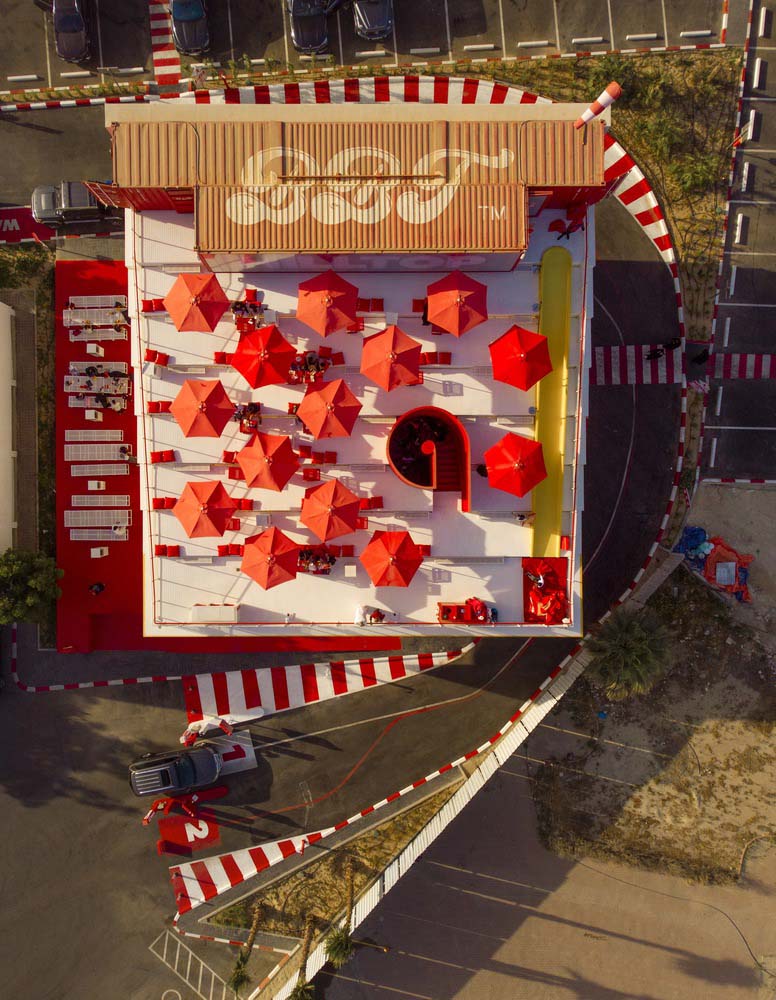 Instalasi dengan lapangan terbuka di lantai bawah yang menyediakan layanan tempat duduk restoran serta drive-in. Kemudian pada lantai atas bangunan terdapat juga area menakjubkan dengan menawarkan pemandangan panorama.