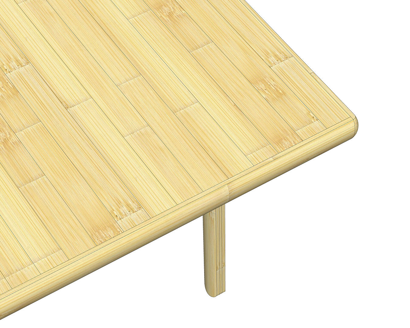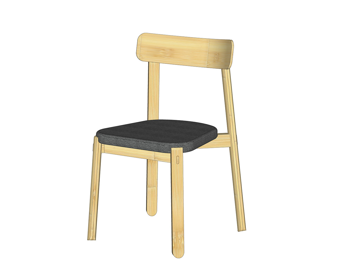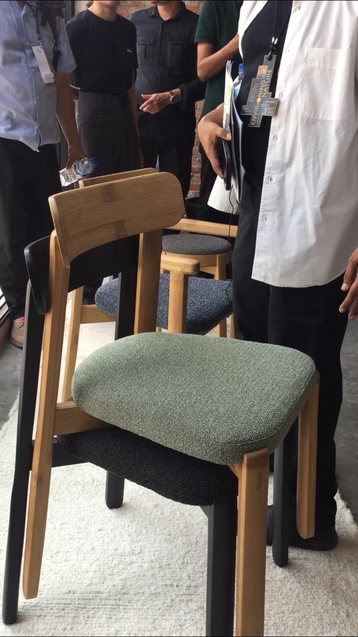 Kemudian dipotong menjadi dua dan dilakukan laminasi serta diamplas sehingga menghasilkan permukaan yang sangat lembut dan juga indah. Desain pada bambu ini tidak hanya meningkatkan kekuatan kursi tetapi juga mengekspos butiran ujung bambu, menambahkan detail yang menarik.