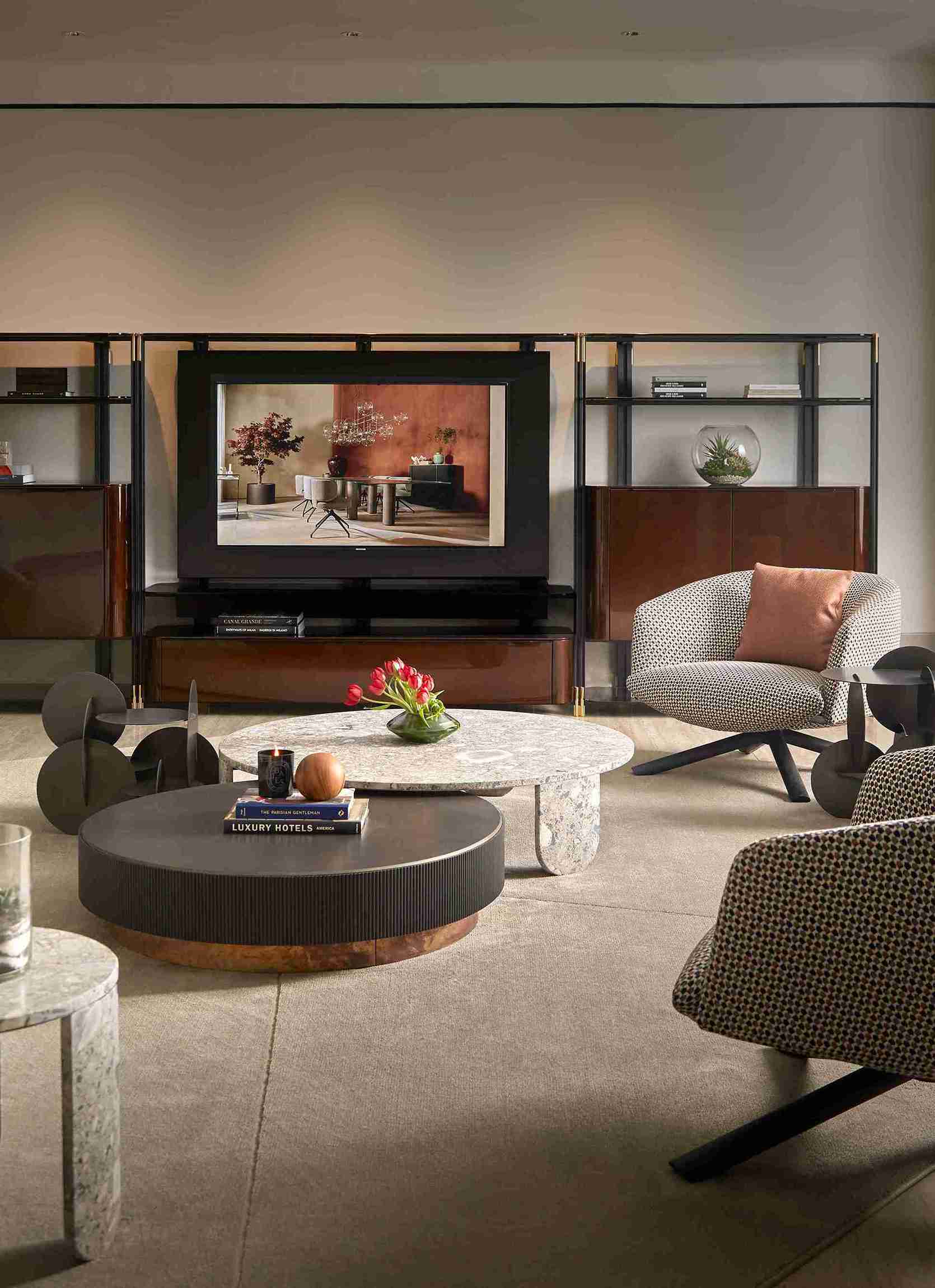 Pada ruang tengah yang berbentuk sederhana ditonjolkan oleh kursi putar Livre yang dirancang oleh Federica Biasi, dengan desain canggih yang menambah kemewahan pada ruangan.