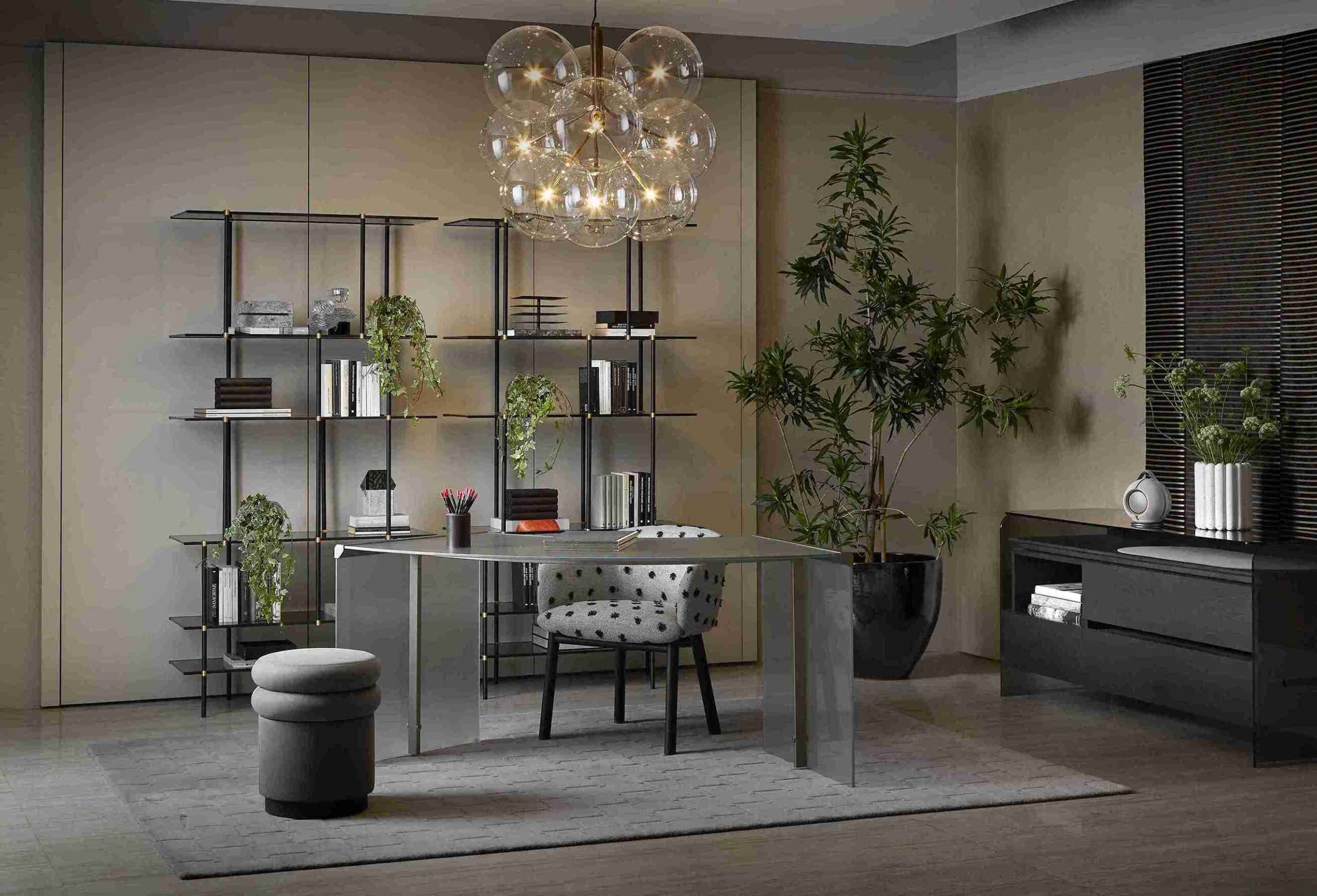 Pada bagian tepi ruangan, menampilkan Holly Comò yang dirancang oleh Pinuccio Borgonovo, sebuah Meja dengan proporsi sempurna dengan dua laci besar, dan kursi kecil yang dapat dilepas dengan bantalan Velvet.