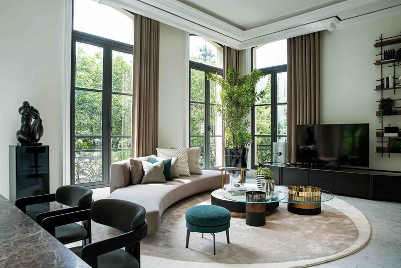 Berlanjut ke dalam showroom, kita bisa menemukan ruang tamu pertama dengan hadirnya Haumea karya Massimo Castagna dan Pris Low karya David/Nicolas, meja kopi yang dipadukan dengan garis berliku-liku dari Audrey. Desain aksesori perabotan sederhana namun elegan ini menjadikan ruangan semakin mewah dan nyaman.