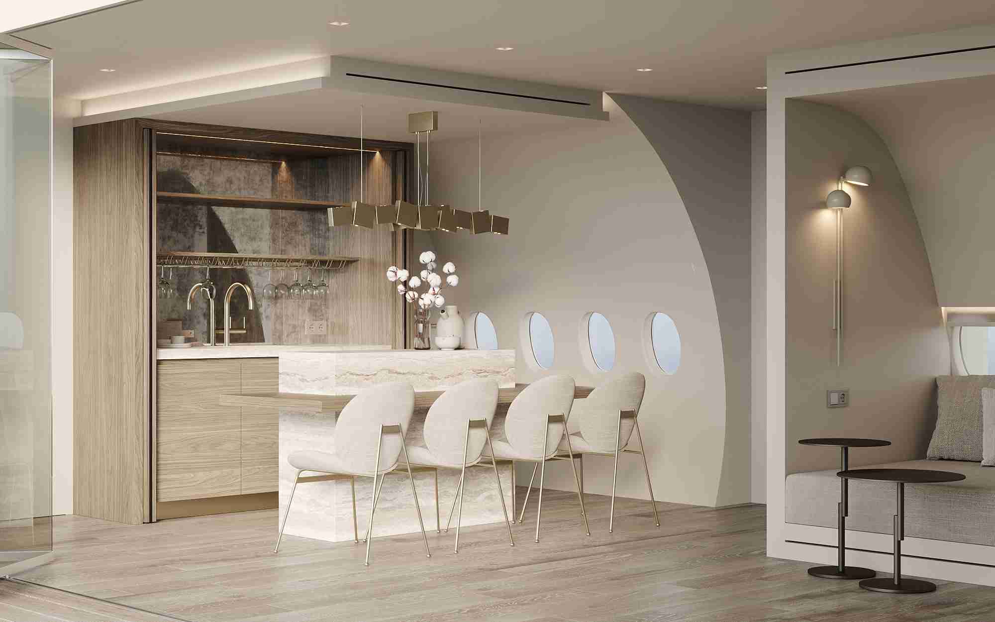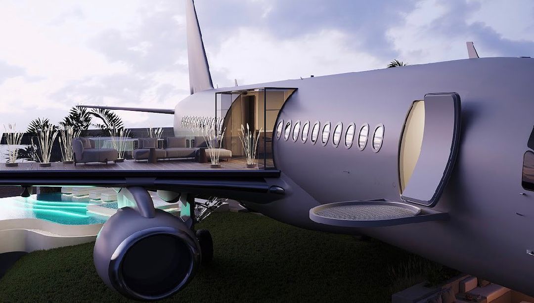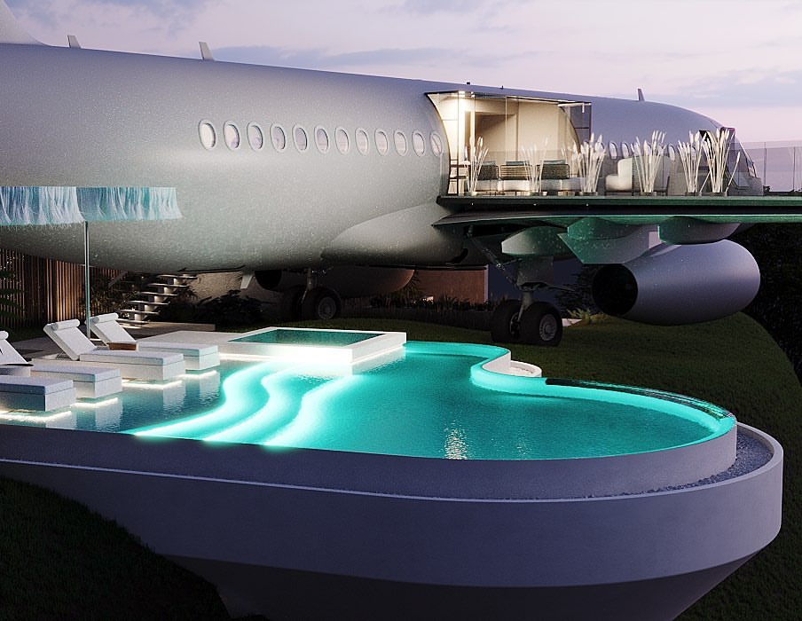 Desain private jet villa ini memperhatikan tata letak yang tepat untuk menciptakan suasana yang mencerminkan keindahan dan kebebasan yang khas dengan pesawat terbang.