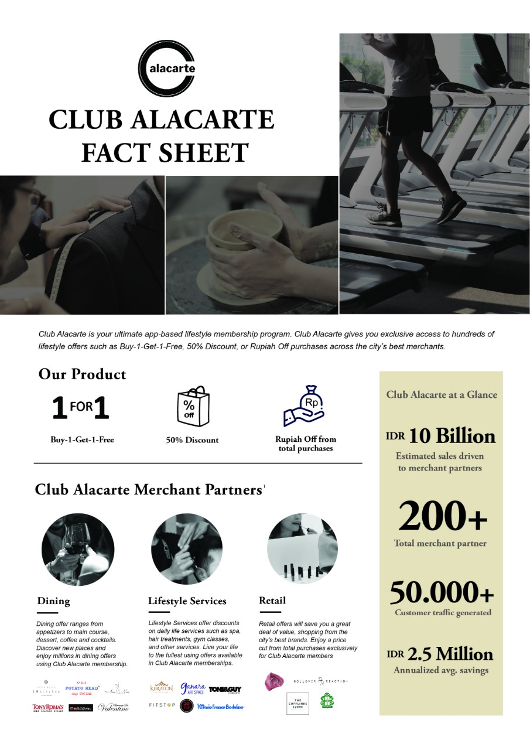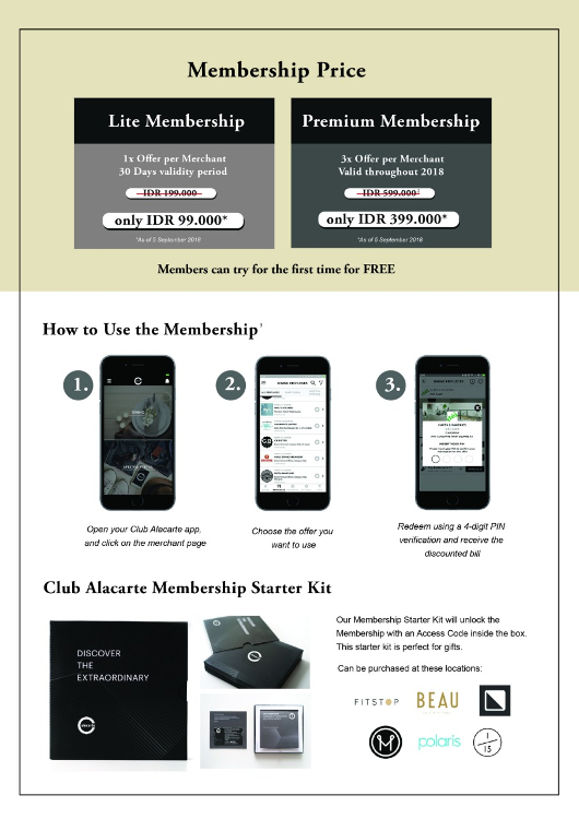 Penawaran fantastis tersebut dapat didapatkan dengan mengaktifkan Club Alacarte Premium membership seharga Rp. 599.000 per tahun. Keanggotaan tersebut dapat dilihat sebagai bentuk investasi kecil yang mampu memberikan keuntungan saving lebih dari Rp. 100.000.000.
