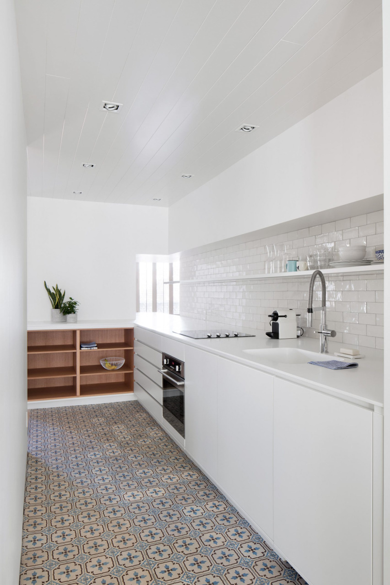 Jika kitchen set juga berwarna putih, maka kombinasikan material kayu di sisi dalam rak. Jika Anda ingin memberikan nuansa yang lebih hidup, pilih keramik lantai yang bermotif serta memiliki beragam warna.