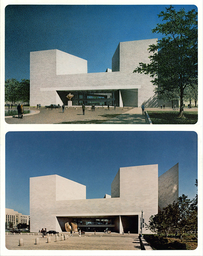 East Building di National Gallery of Art di Washington D.C karya I. M. Pei. Atas: Sketsa tangan Steve pada tahun 1976. Bawah: Foto bangunan saat pertama kali berdiri pada tahun 1978