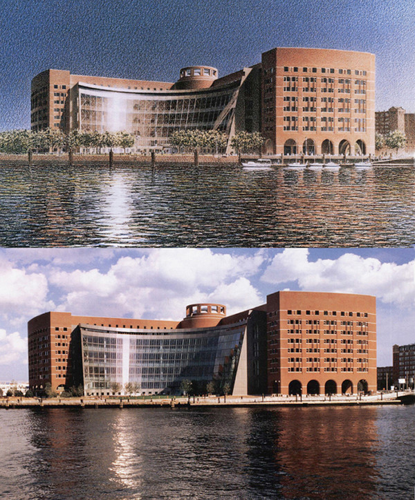 Sketsa tangan Steve (1993) dan foto (1998) Moakley Federal Courthouse karya Henry N. Cobb, FAIA