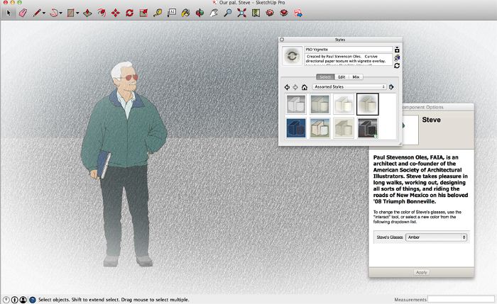 Sebagai pengguna setia dan guru dari perangkat lunak SketchUp, terdapat Style bernama PSO Vignette (bagian Assorted Style) yang merupakan rancangan khusus dari Steve untuk SketchUp.