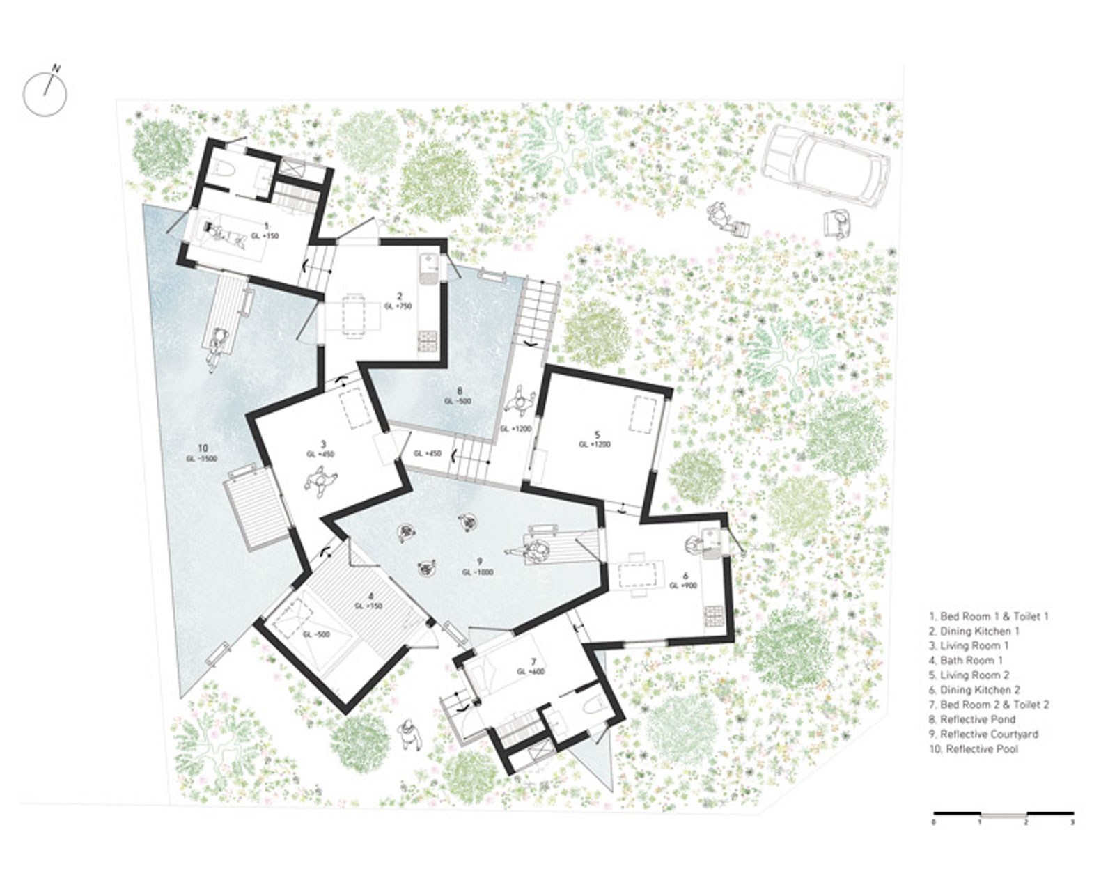Setiap bangunan karya arsitek asal Korea ini memiliki ketinggian lantai dan sudut yang berbeda. Hal itu bertujuan agar penghuni dapat merasakan tinggal di dalam rumah tanpa mengubah bentuk asli permukaan tanah. Nantinya, penghuni dapat menentukan fungsi dari masing-masing bangunan, seperti kamar mandi, ruang tidur dan ruang bersantai. Masing-masing bangunan memiliki jalur penghubung untuk mempermudah akses penghuni.
