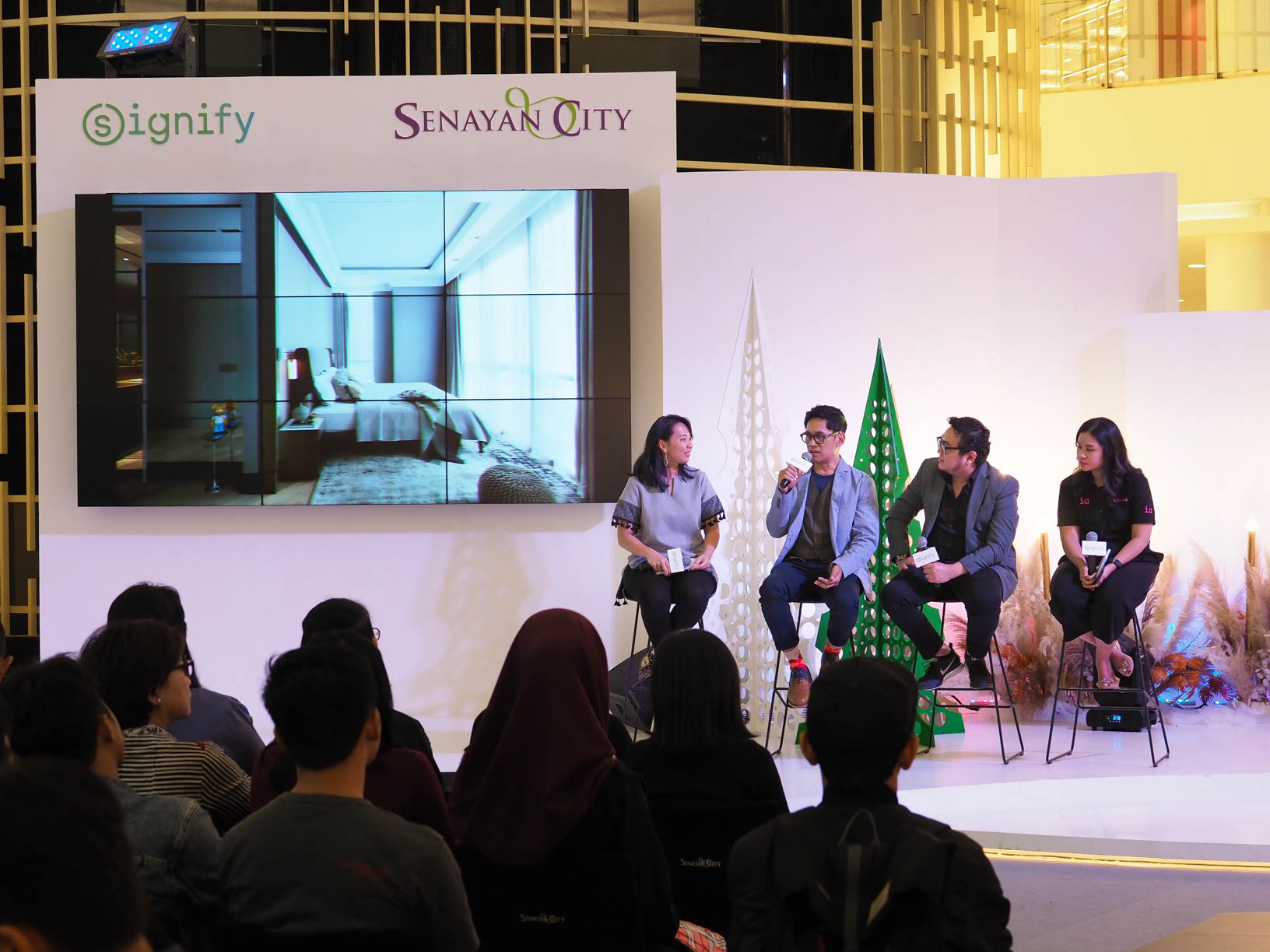 Ki-Ka: Raisa Benaya Ranti (Editor CASA Indonesia), Eko Priharseno (Interior Designer & Principal Aedi Interior), Thomas A. Jonathan (Lighting Designer & Principal Artmosphere Lighting Design), Anandya Putri Yulzandi (Specification Specialist dari Signify)
