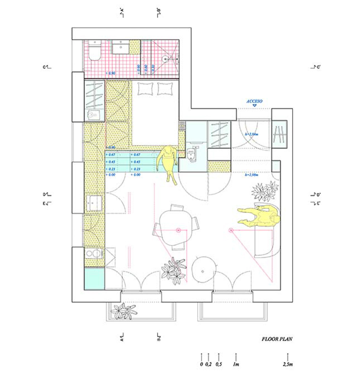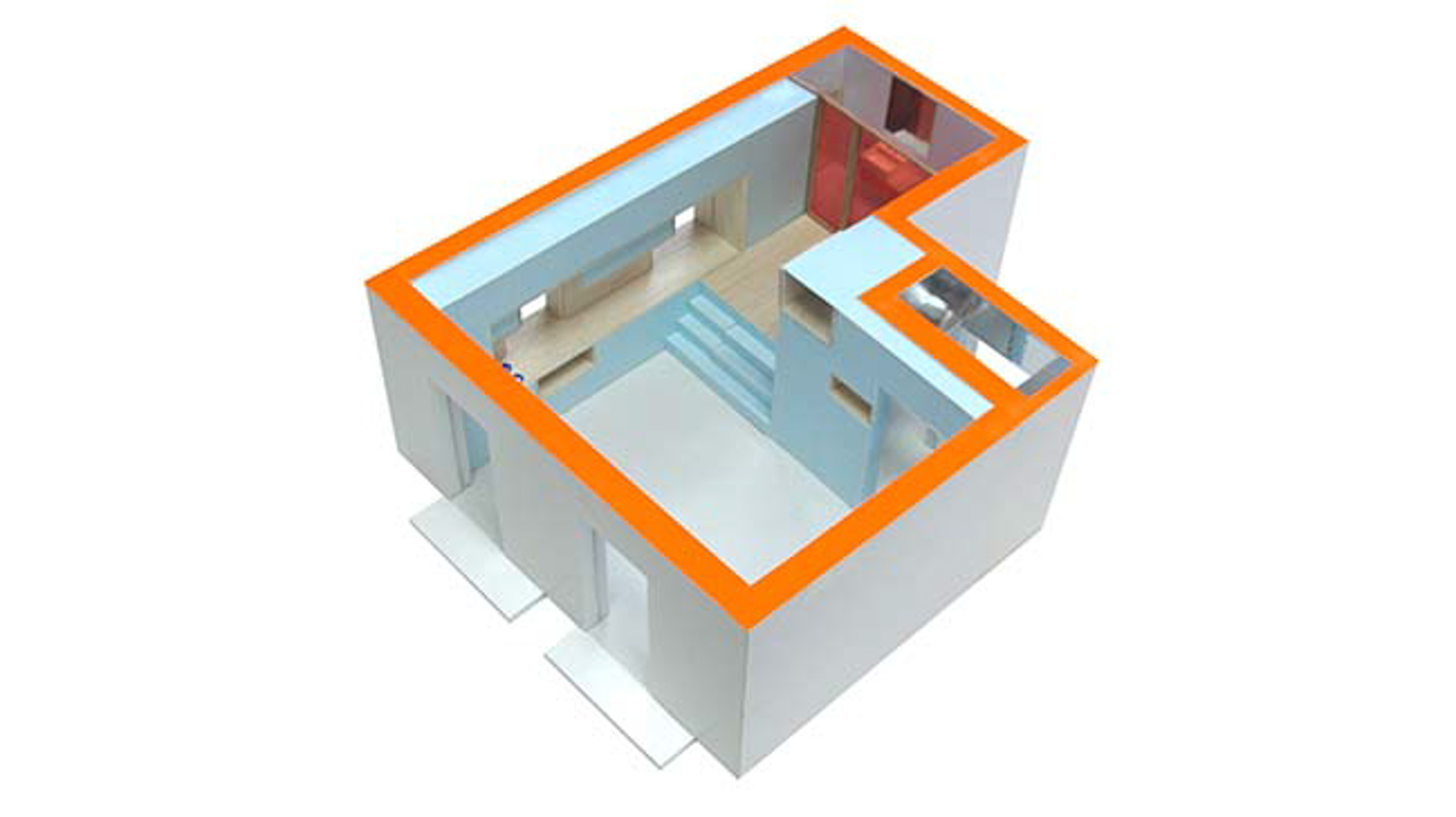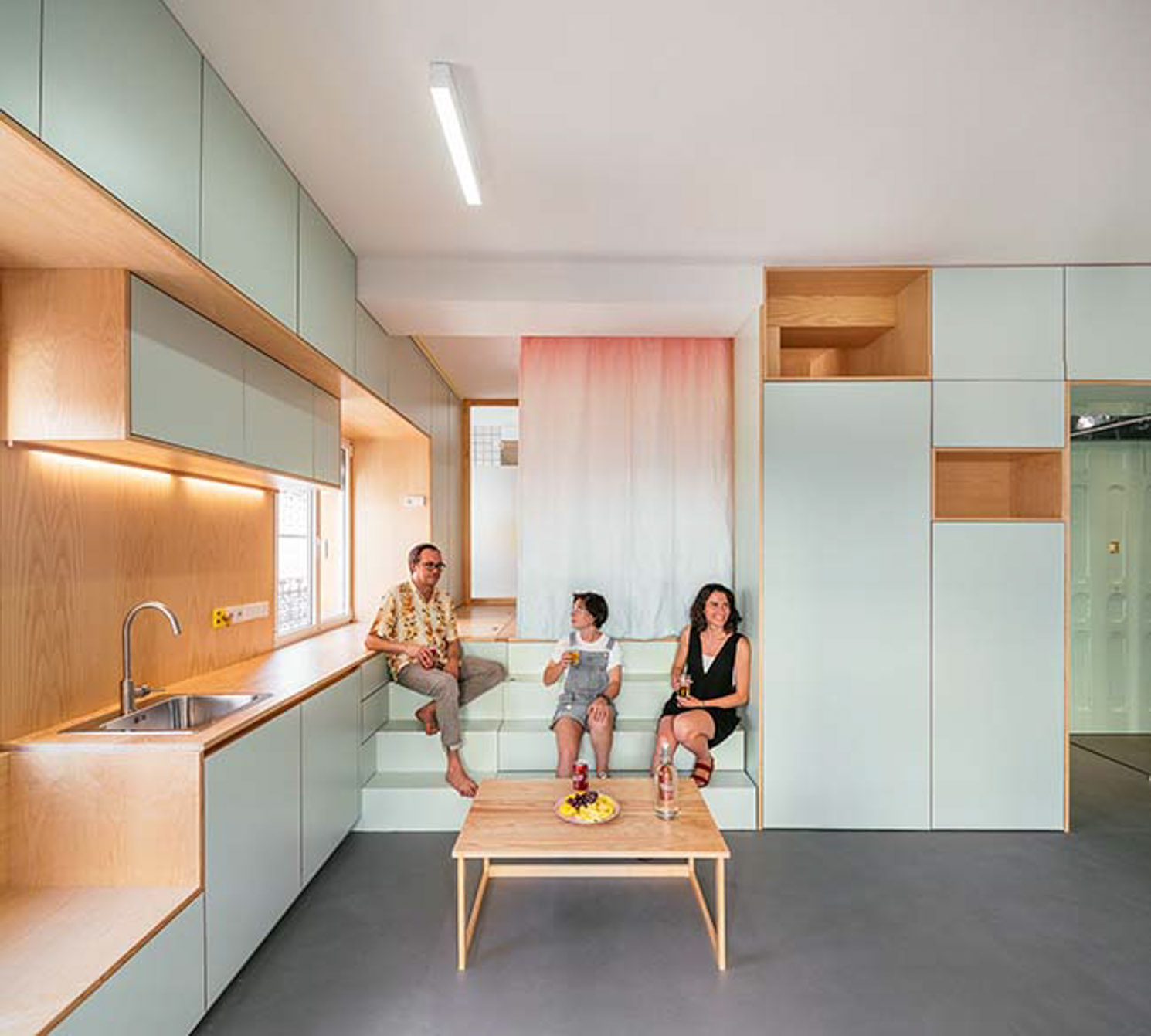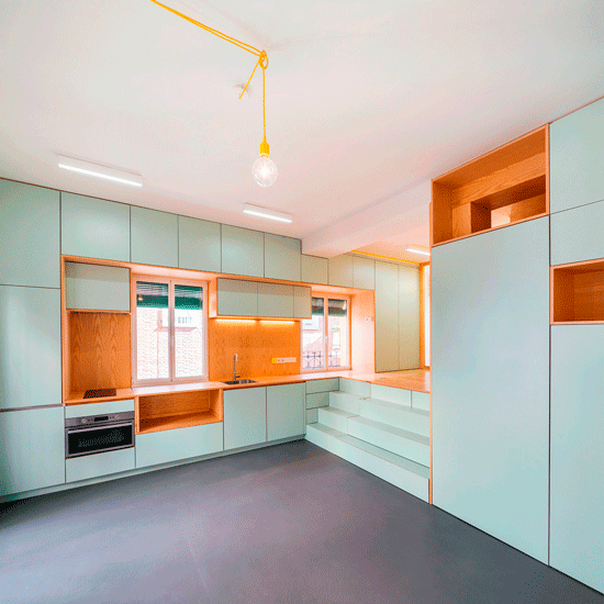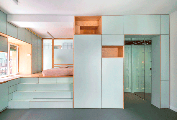 Elii, desainer asal Spanyol merancang sebuah kamar studio yang terdiri dari ruang tidur, living room, dapur, kamar mandi, dan lengkap dengan segala tempat penyimpanan.Â