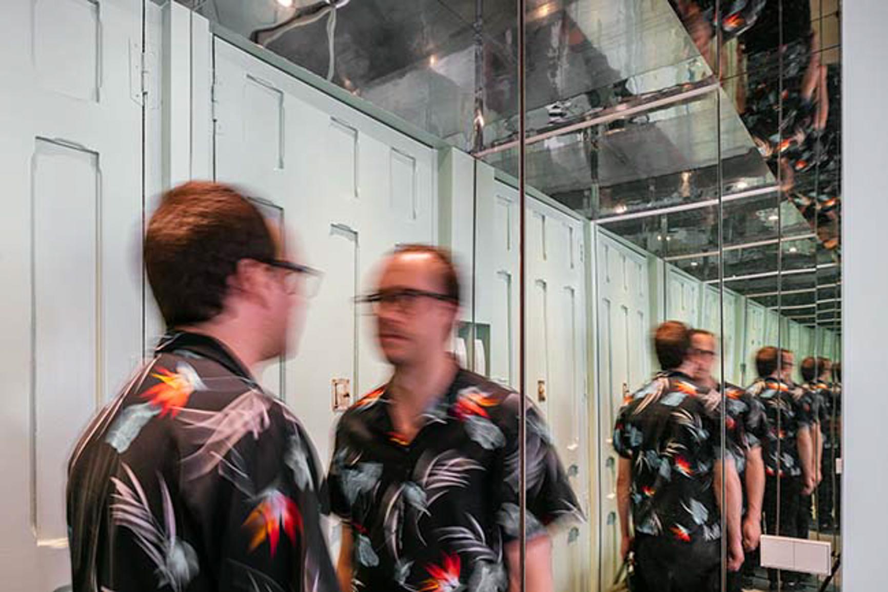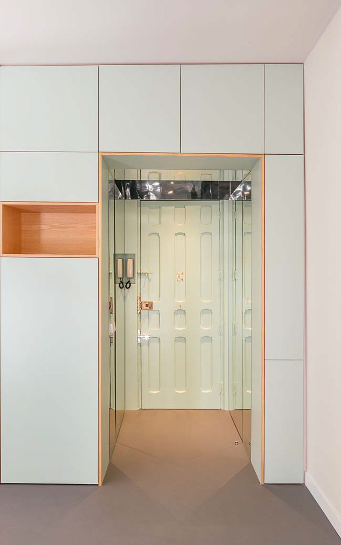 Untuk menciptakan kesan yang luas, Anda dapat mengaplikasikan cermin sebagai pelapis dinding. Seperti terlihat pada foyer (area pintu masuk), terdapat dinding cermin yang secara langsung memberikan kesan luas saat memasuki ruangan. Tak hanya berada di satu sisi, sang desainer meletakkan di dua dinding yang berseberangan. Berkat desain seperti ini, kesan infinity tampil menarik bagi para tamu.
