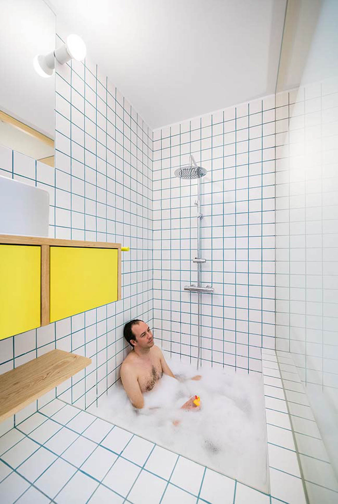 Penghematan ruang juga meliputi area kamar mandi, seperti pada area shower yang juga dapat berfungsi sebagai bathtub.
