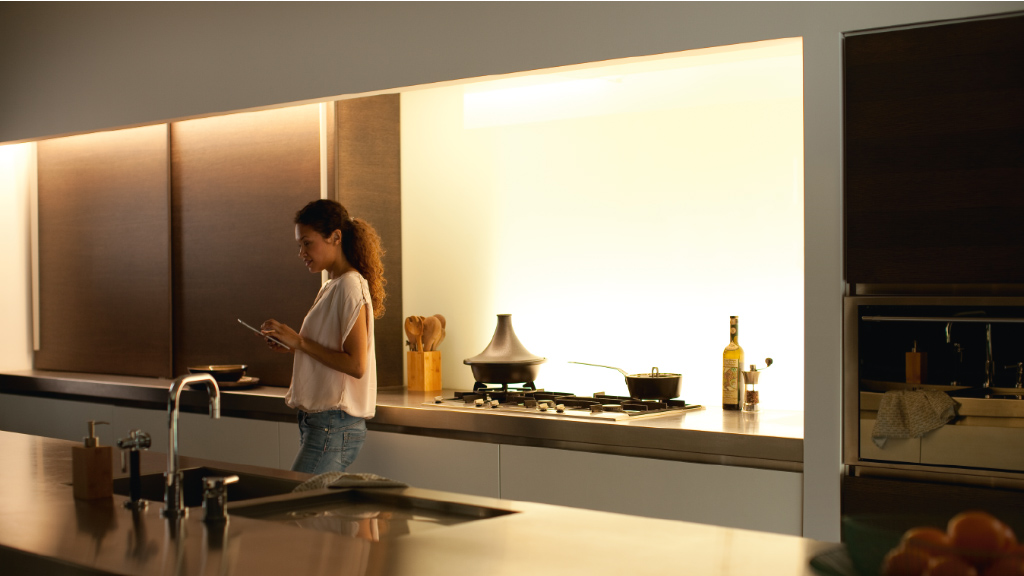 Tata kembali pencahayaan dapur Anda. Tambahkan spotlight kecil pada interior lemari pintu kaca atau bawah kabinet untuk penerangan meja dapur yang dramatis. Gunakan lampu LED pintar terintegrasi, sehingga dapat diatur sesuai kebutuhan Anda. Disarankan menggunakan lampu berwarna putih agar tidak mengubah warna makanan.
