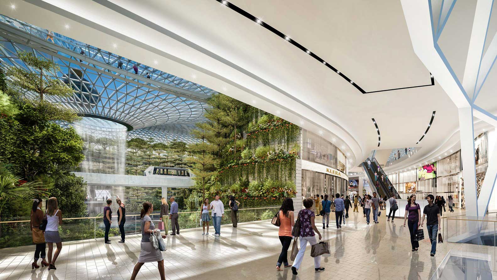 Sementara pada kedua sisi taman, terdapat lima tingkat area perbelanjaan yang memungkinkan traveler untuk berbelanja sekaligus refreshing setelah suntuk dengan penerbangan.