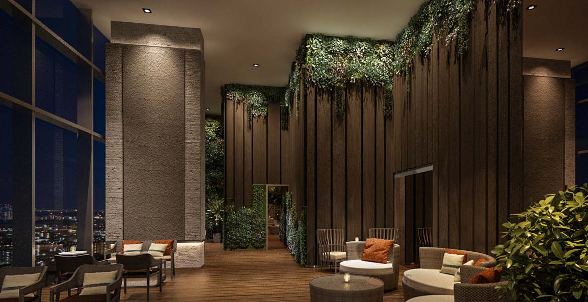 Area sky terrace yang menampilkan pemandangan kota Jakarta dari atas ketinggian lantai 33.