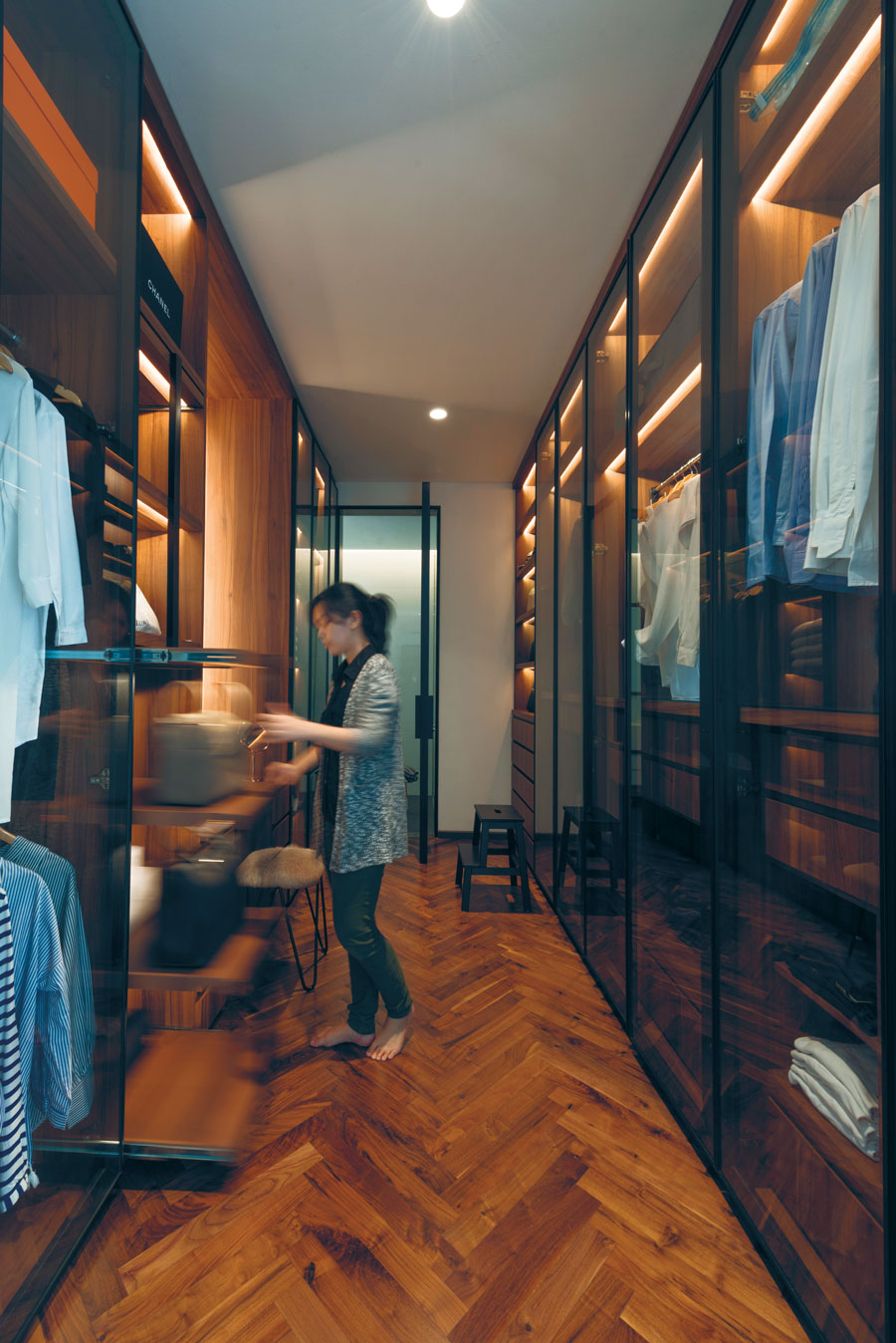 Dengan demikian, sebuah koridor dihadirkan sebagai enterance kamar tidur utama yang kemudian menjadi salah satu cara menjaga privasi penghuni. Kisi-kisi kayu lantas diciptakan sebagai elemen menarik pada koridor tersebut yang menjadi aksentuasi see through ke dalam walk-in closet dengan konsep terbuka. Memadukan kreativitas dan estetika seraya mengoptimalisasi fungsi adalah kunci kenyamanan desain split level house ini.