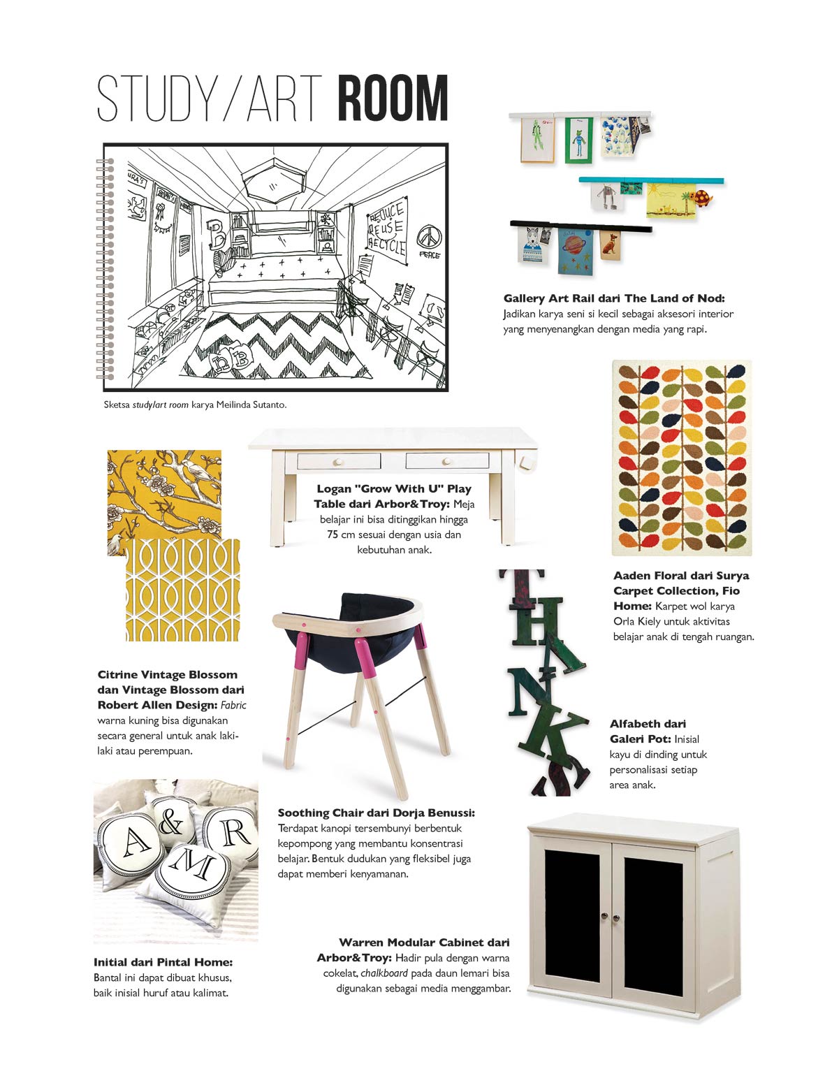 Untuk edisi ini, kami mengajak Ria Finola berkenalan dengan desainer, Meilinda Sutanto untuk merancang study room dan art room untuk ketiga anaknya yang memilki karakter yang berbeda-beda.